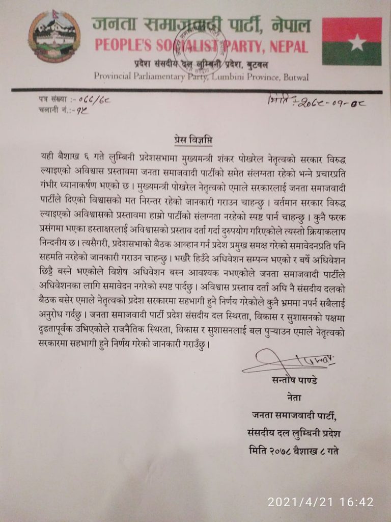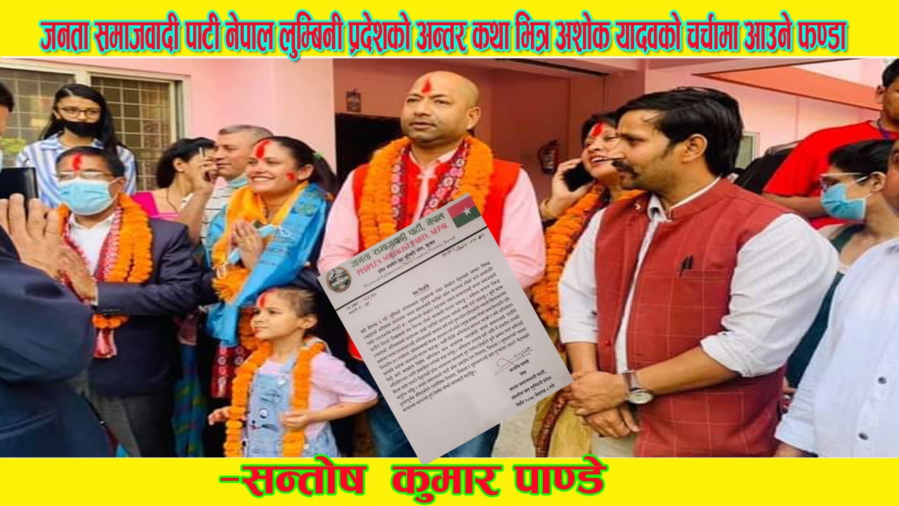 बैकल्पिकराष्ट्रिय शक्तिको रूपमा स्थापित जसपालाई भावनात्मक रूपमा एकताहुन नदिने विभिन्न तत्वहरू मध्ये नेतृत्व गरिरहेको अशोक यादव विरूद्द खेद प्रकट गर्दै लुम्बिनी प्रदेश जसपाको संसदीय दलको नेता तथा भैतिक मन्त्री सन्तोष कुमार पाण्डेको हस्ताक्षरमा आएको बिज्ञप्ति ।