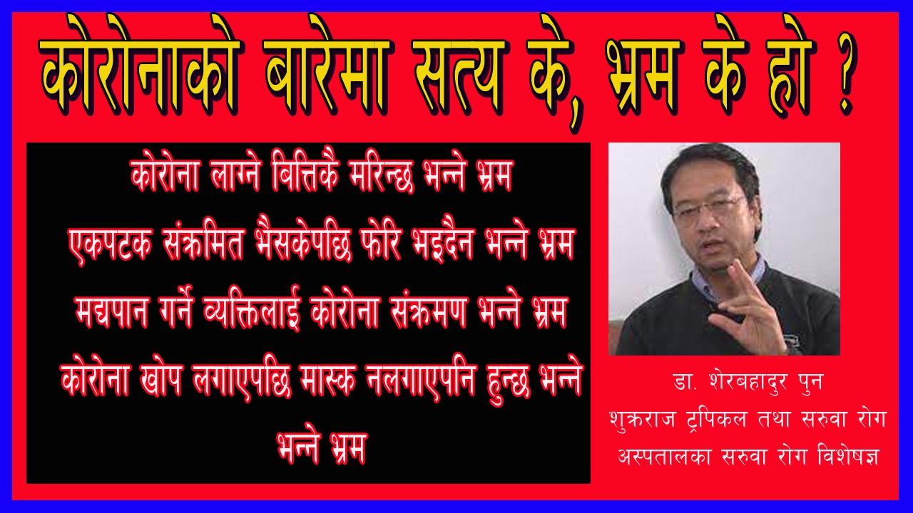 काठ्माडौं। यतिबेला नेपालमा कोरोना भाइरसको संक्रमण तीव्र गतिमा बढीरहेको छ । योसँगै कोरोनासँग सम्बन्धित भ्रम व्याप्त छन् । जसले आम मानिसमा अन्यौल र त्रास पैदा गरिरहेको छ।आखिर कोरोनाको बारेमा के सत्य के भ्रम हो ? यस विषयमा शुक्रराज ट्रपिकल तथा सरुवा रोग अस्पतालका सरुवा रोग विशेषज्ञ डा.शेरबहादुर पुनको धारणा यस्तो छ।