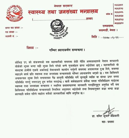 कोहि पनि नागरिक स्वास्थ्य सेवापाउन बाट बन्चितहुन नपरोस् भन्ने हेतुले निजि अस्पतालहरुलाई समेत सचेत गराईएकोले त्यसको अटेरगरी जथाभाबि शुल्क लिने तथा सेवाप्रदान गर्न आनकानि गरेमा त्यस्ता अस्पताललाई तुरुन्तै कार्वाहि गरीने पनि मन्त्रालयले आफ्नोप्रेस नोटमा जनाएको छ ।