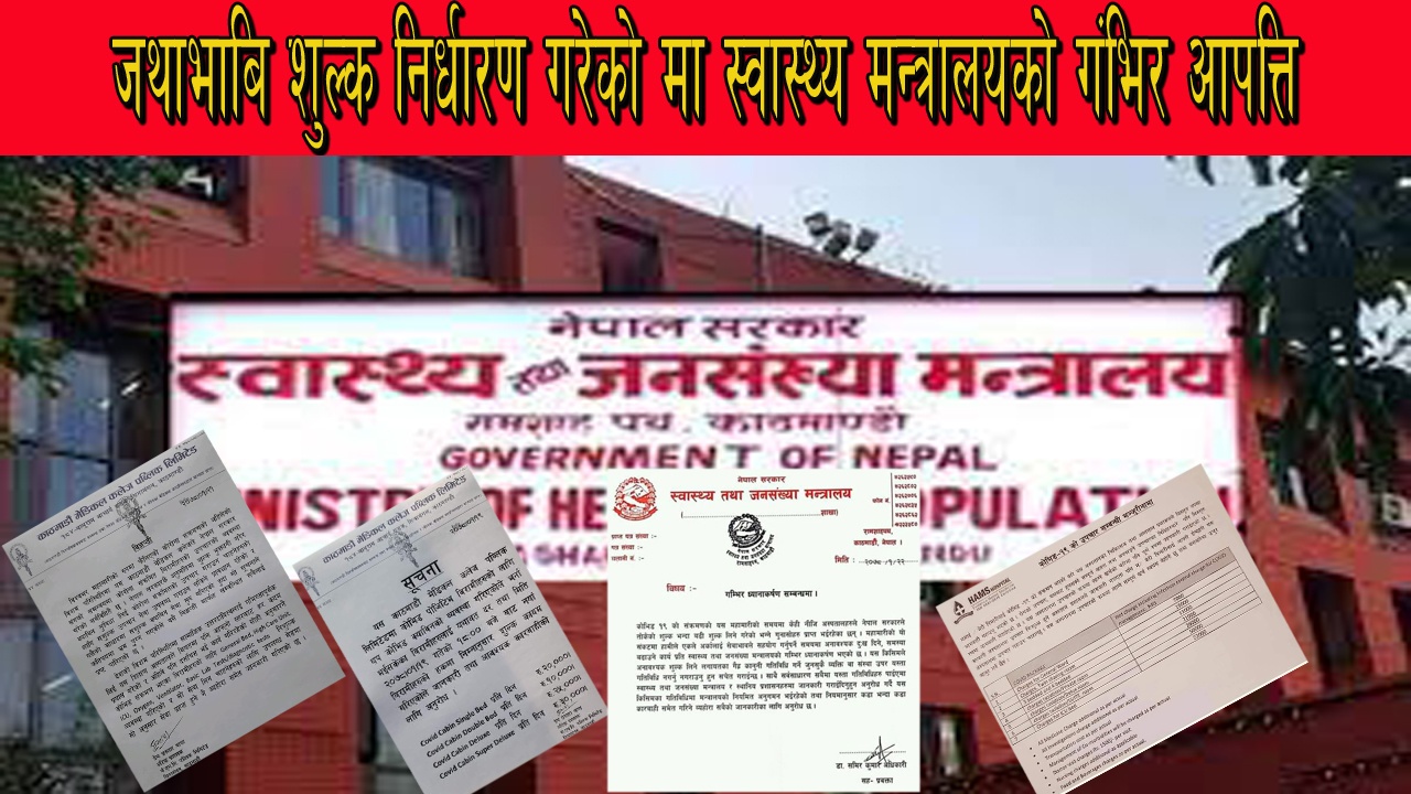 काठमाण्डौं। निजि अस्पतालहरुले आफुखुसि आफ्नो सेवाको मुल्यनिर्धारण गरेको गुनासो आएको भन्दै स्वाथ्य मन्त्रालयले त्यसप्रति आफ्नो गंभिर ध्यानाकर्षण भएको बताएको छ ।