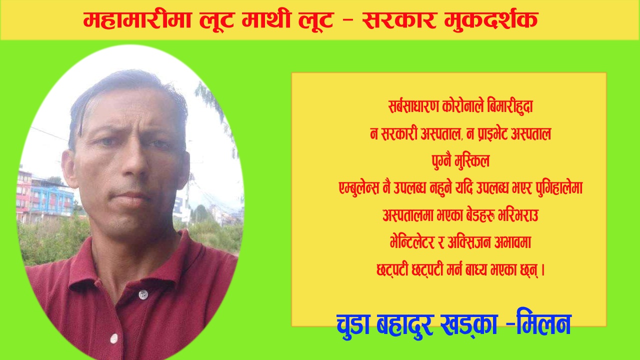 सर्बसाधारण कोरोनाले बिमारीहुदा न सरकारी अस्पताल, न प्राइभेट अस्पताल पुग्नै मुस्किल एम्बुलेन्स नै उपलब्ध नहुने यदि उपलब्ध भएर पुगिहालेमा अस्पतालमा भएका बेडहरु भरिभराउ भेल्टिलेटर र अक्सिजन औसधि उपचारको अभावमा छट्पटी छट्पटी मर्न बाध्य भएकाछ्न ।