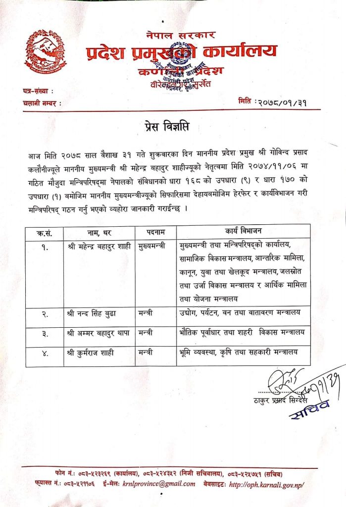 दैलेख । कर्णाली प्रदेशमा नयाँ नियुक्त भएका नेकपा माओवादी केन्द्रका तीन मन्त्री सपथ नखाँदै बर्खास्तमा परेका छन्।