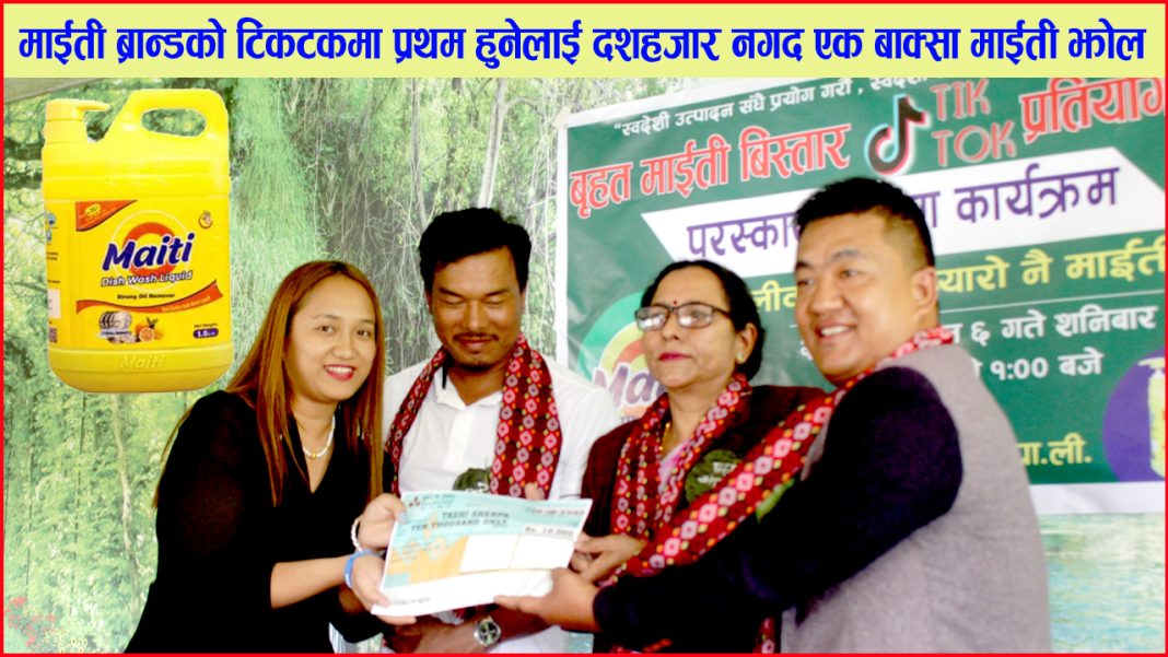 नेपाली महिलाहरुको महान चाडको रुपमा लिईने हरितालिका तिज को उपलक्ष्यमा माईती ब्रान्डले आफ्नो जिंगलमा टिकटक बनाएर पोष्ट गर्ने मध्य सर्वोकृष्ट ५ जनालाई पुरस्कार दिने घोषणा गरेको थियो । सोहि अनुरुप आज ५ जनालाई सम्मान गरिएको छ ।