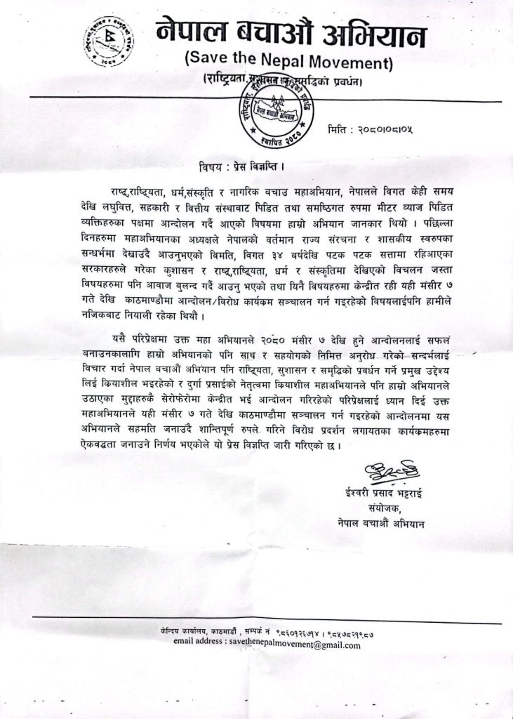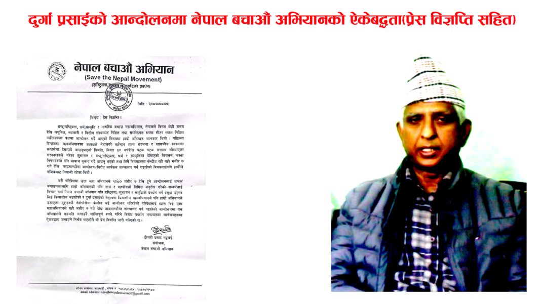यसै परिप्रेक्षमा उक्त महाअभियानले २०८० मंसीर ७ देखि हुने आन्दोलनलाई सफलं बनाउनकालागि हाम्रो अभियानको पनि साथ र सहयोगको निमित्त अनुरोध गरेको सन्दर्भलाई विचार गर्दा नेपाल बचाओं अभियान पनि राष्ट्रियता, सुशासन र समृद्धिको प्रवर्धन गर्ने प्रमुख उद्देश्य लिई क्रियाशील भइरहेको र दुर्गा प्रसाईको नेतृत्वमा क्रियाशील महाअभियानले पनि हाम्रो अभियानले उठाएका मुद्दाहरुकै सेरोफेरोमा केन्द्रीत भई आन्दोलन गरिरहेको परिप्रेक्षलाई ध्यान दिई उक्त महाअभियानले यही मंसीर ७ गते देखि काठमाण्डौमा सञ्चालन गर्न गइरहेको आन्दोलनमा यस अभियानले सहमति जनाउदै शान्तिपूर्ण रुपले गरिने विरोध प्रदर्शन लगायतका कार्यक्रमहरुमा ऐकवद्धता जनाउने निर्णय भएकोले यो प्रेस विज्ञप्ति जारी गरिएको छ ।
