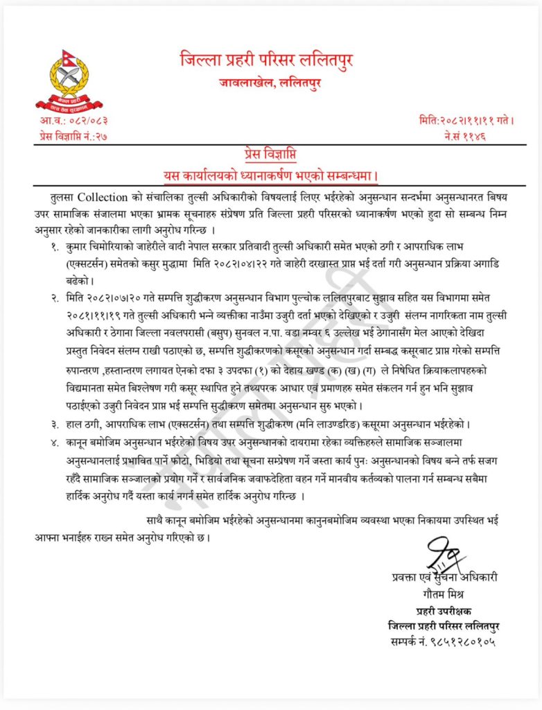 प्रहरीले अनुसन्धानको दायरामा रहेका व्यक्तिले सामाजिक सञ्जालमा अनुसन्धानलाई प्रभावित पार्ने गरी भ्रामक फोटो, भिडियो र सूचना सम्प्रेषण गर्ने कार्य आफैँमा पुनः अनुसन्धानको विषय बन्नेतर्फ सजग गराएको छ।