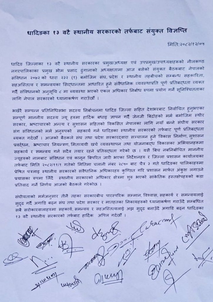 संयुक्त विज्ञप्तिमा सांसद तामाङले दिएको निर्देशन र जिल्ला प्रशासन कार्यालयमार्फत चैत ३ गते पठाइएको पत्रलाई स्थानीय सरकारको अधिकार सीमित गर्ने प्रयासका रूपमा व्याख्या गरिएको छ। जनप्रतिनिधिहरूले प्रशासनिक हस्तक्षेपमार्फत स्थानीय तहलाई नियन्त्रण गर्ने प्रवृत्ति उचित नभएको बताएका छन्।