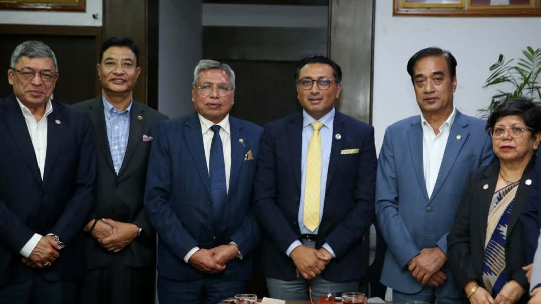 काठमाडौं। नेपाल चेम्बर अफ कमर्सका पदाधिकारीहरूको प्रतिनिधिमण्डलले अर्थमन्त्री डा. स्वर्णिम वाग्लेसँग भेट गरी वर्तमान आर्थिक अवस्था, नीतिगत सुधार तथा निजी क्षेत्रका समस्याबारे विस्तृत छलफल गरेको छ । चेम्बरका अध्यक्ष कमलेश कुमार अग्रवाल नेतृत्वको टोलीले सरकारसँग समन्वय र सहकार्य मार्फत आर्थिक पुनरुत्थानको आवश्यकता औंल्याएको थियो ।